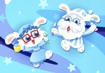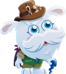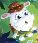 Buster is a white-haired rabbit-like monster, with bulging blue eyes and a bold moustache. He wears a hat with what appears to be animal tranquilisers circled around it, a typical piece of headgear for explorers. He is often seen carrying an azure walking stick, a sign of old age, and his small body appears clad in an office green overall, a brown t-shirt beneath it. He also wears a backpack in a similar fashion to the brown t-shirt, as well as a red scarf.