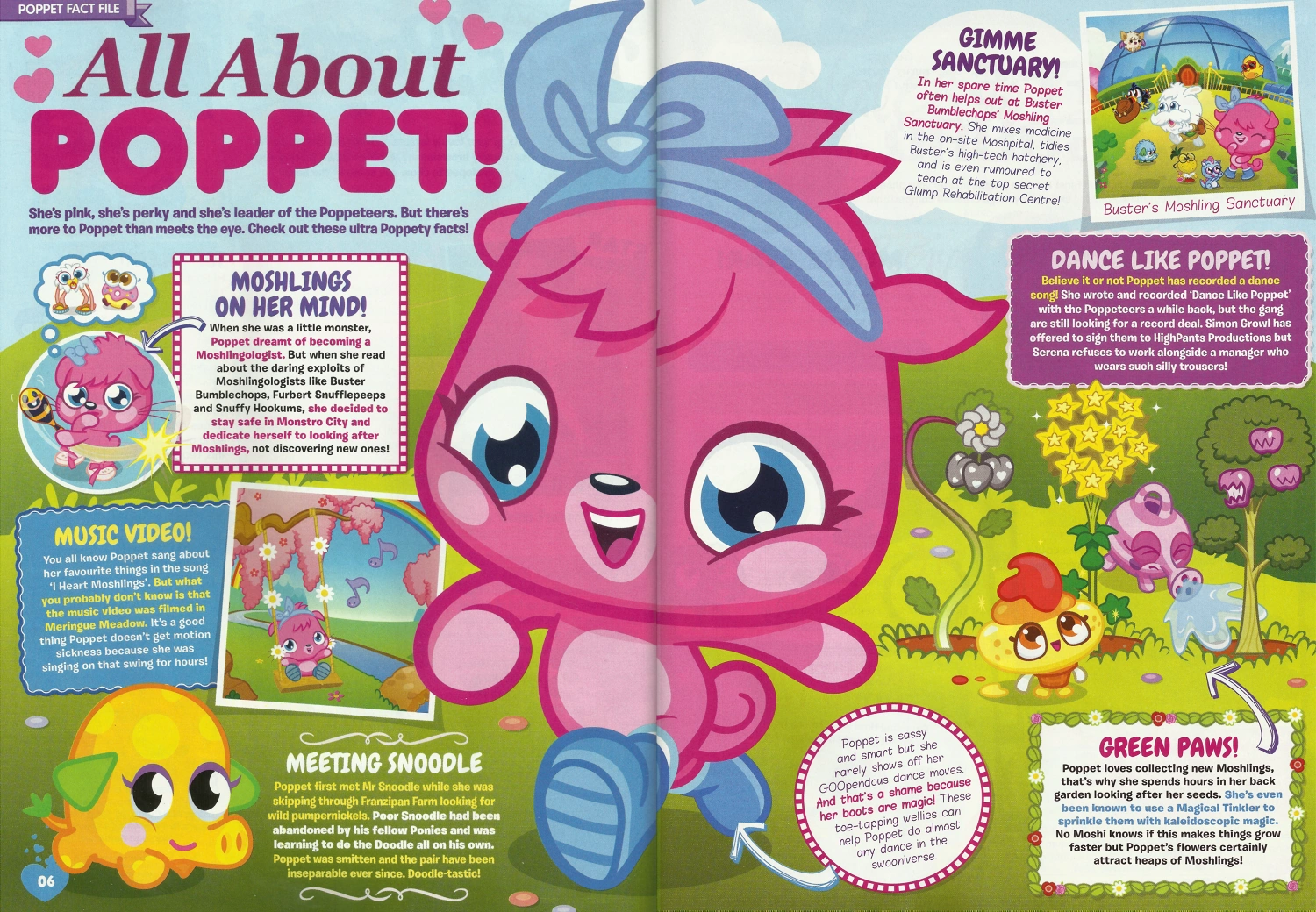 Impossible cute but brave and steely, Poppet is the Moshi Monster who is super-passionate about Moshlings. She is always planting Moshling seeds in her backyard to attract more Moshlings, and is a very close to Mr Snoodle, her pet Silly Snuffler. Did you also know that she's a great dancer thanks to her enchanted boots!