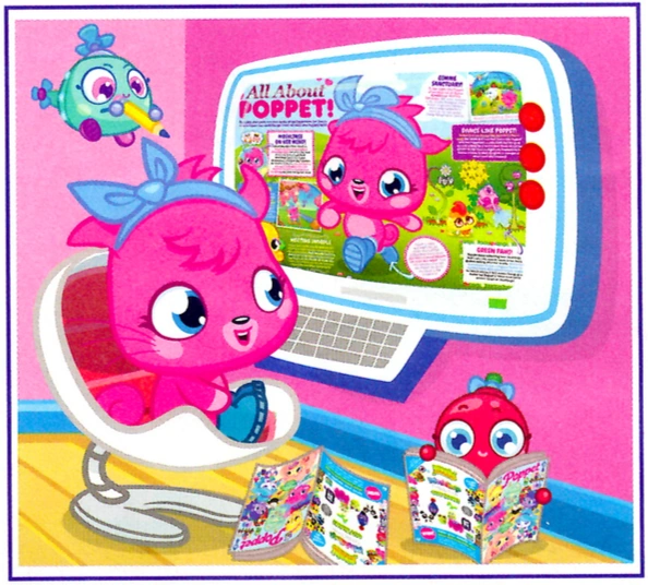 Several magazines such as the Moshi Monsters Magazine, Moshlings Making and Baking, and the Poppet Magazine feature Poppet. The BFF Magazine also shows brief appearances of her. Poppet is a character in stories within both the Moshi Monsters and Poppet Magazines.