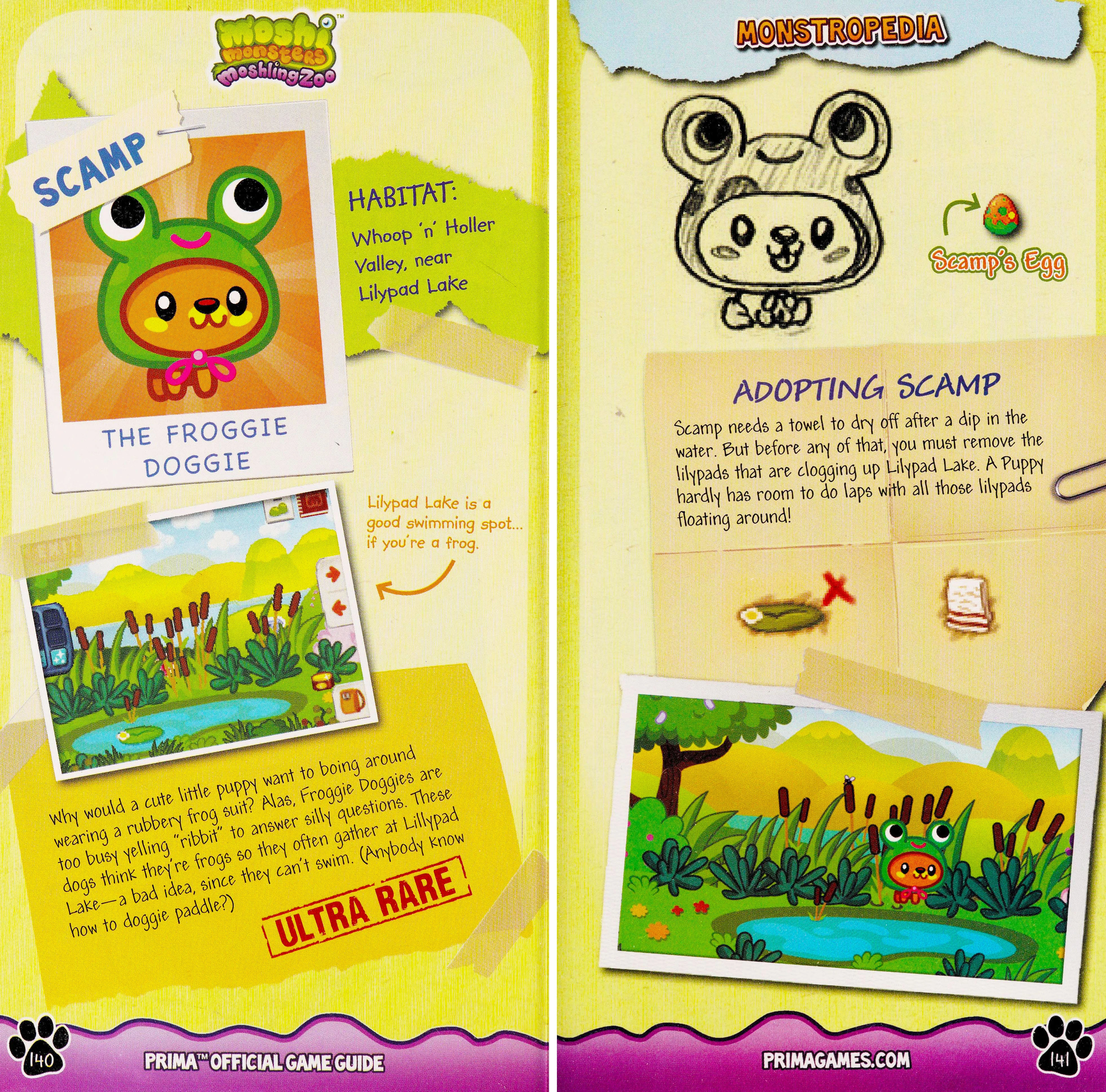 Scamp the Froggie Doggie is an Ultra Rare Moshling in the Puppies set. They cannot swim and use their frog headgear to keep afloat. Scamp often makes frog sounds.