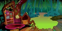 A pink rug covers the floor with a cauldron on top of it that looks faintly like a Naughty Nutter's head and is a lot smaller than Big Bad Bill's Cauldron. The rug has been burned beneath the cauldron for obvious reasons. A wooden cabinet with four shelves on the side hold several bottles with substance -one having eyeballs- in it, something that seems to be a malfunctioning TV screen and some artistic exploits of strings with marbles. Another tiny cabinet with one drawer features the microwave on top.
